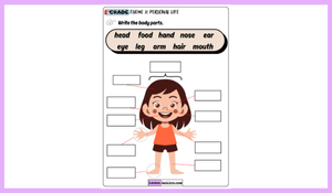 Bu etkinlik, öğrencilerin temel İngilizce vücut bölümlerinin (baş, ayak, el, burun, kulak, göz, bacak, kol, saç, ağız) yazılışlarını hatırlama ve bunları doğru görsellerle eşleştirme becerilerini test eder. Bu çalışma kağıdı kelime bilgisi pekiştirme için idealdir.