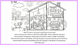Okuma Anlama Pratiği: Öğrenciler öncelikle "Read." yönergesini takip ederler. Oturma odası, yatak odası ve mutfak gibi evin bölümlerini anlatan kısa ve anlaşılır bir İngilizce metni okurlar.