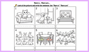 Devam eden etkinliklerde öğrenciler, görselleri inceleyerek doğru yapıyı seçme (There is / There are) ve ardından kendi cümlelerini oluşturma fırsatı bulurlar. Bu süreç, öğrencilerin hem dil bilgisi hem de yazma becerilerini geliştirmelerine yardımcı olurken, görseller sayesinde öğrenmeyi daha kalıcı ve keyifli hale getirir.