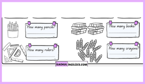 Alt bölümde ise “How many...?” (Kaç tane...?) sorularıyla desteklenmiş görsel etkinlikler bulunur. Bu bölümde öğrencilerden, verilen nesneleri sayarak uygun sayıyı yazmaları istenir. Bu, öğrencilerin: