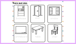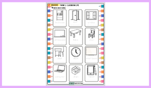 2. sınıf 2. tema classroom life ile ilgili olarak öğrencilerin sınıf içindeki temel nesneleri tanımalarına yardımcı olmayı amaçlayan bu çalışma sayfası, hem görsel hem de sözel öğrenmeyi destekler. Tema içindeki sınıf eşyalarının altına bir kez kelimelerin üzerinden geçerek ve bir kez de kendileri yazarak sınıf eşyalarını öğrenmeleri hedeflenmektedir. Siyah-beyaz çizimler öğrencilerin boyama yaparak çalışmayı eğlenceli bir şekilde tamamlamalarına imkan verecektir.