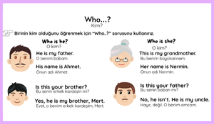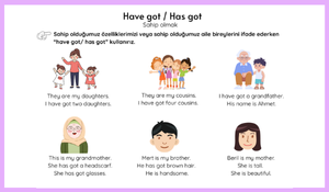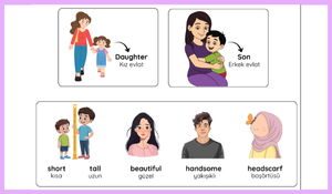 Aile bireyleri (father, mother, sister, brother, grandparents vb.), fiziksel özellikler (tall, short, beautiful, handsome, headscarf) ve temel kalıplar (Who is he/she?, This is…, have got / has got) örnek cümleler ve görsel destekli etkinliklerle sunulmaktadır.