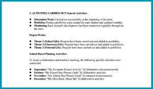 Yapılan Çalışmaların Özeti: Uyum haftası (Orientation Week), düzenli tutulan ürün portfolyoları (Product Portfolios) ve her tema için özel olarak planlanan proje çalışmaları (Örn: Theme 1 için "Greeting Card", Theme 3 için "My Body Puppet") detaylandırılmıştır.