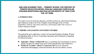 Dönem sonu gelirken evrak işleri gözünüzde büyümesin! ilkokulingilizce.com olarak, 2. sınıf İngilizce dersi için idareye sunmanız gereken **"Ders Süreci İzleme ve Değerlendirme Raporu"**nu sizin için hazırladık. Yeni müfredatımız Türkiye Yüzyılı Maarif Modeli'ne tam uyumlu bu taslakla işleriniz çok kolaylaşacak.