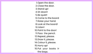 Öğrencilerin sınıf içi yönergeleri tanımasını, anlamasını ve doğru şekilde uygulamasını destekler. “Open the door”, “Sit down”, “Raise your hand”, “Listen” gibi temel classroom commands ifadeleri görüntü destekli olarak sunulmuş ve eşleştirme etkinliği ile pekiştirilmiştir.