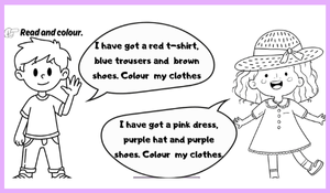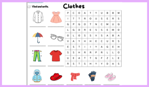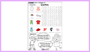Çalışmanın ilk bölümünde öğrenciler, kıyafetlerle ilgili kelimeleri içeren bir kelime avı (wordsearch) etkinliğini tamamlayarak kelime tanıma ve doğru yazım becerilerini pekiştirebilecekler. Ardından kısa ve basit yönergeleri okuyup resimleri verilen renklere boyayarak okuduğunu anlama ve yönerge takip etme becerilerini desteklerler.