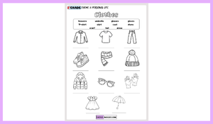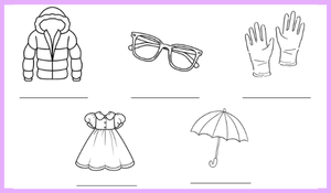 Etkinlikte çeşitli giysi görselleri yer almaktadır (örneğin: shirt, T-shirt, trousers, shoes, scarf, hat, coat, glasses, gloves, dress, umbrella). Öğrencilerden beklenen, her görselin altına doğru İngilizce kelimeyi yazmalarıdır.
