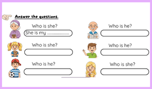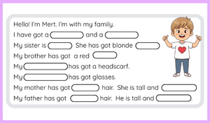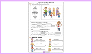 2. sınıf İngilizce dersi Family Life teması kapsamında öğrencilerin aile bireylerini tanıma ve tanıtma becerilerini geliştirmek amacıyla hazırladığımız bu çaılşma kağıdı ile öğrenciler; anne, baba, kardeş, büyükanne ve büyükbaba gibi aile üyelerini İngilizce olarak ifade ederken aynı zamanda fiziksel özellikler (saç rengi, boy, gözlük, şapka gibi) hakkında temel kelime bilgilerini pekiştirir. Görsel destekli etkinlikler sayesinde öğrenme süreci eğlenceli ve kalıcı hâle gelirken, öğrencilerin okuma, yazma ve basit soru-cevap becerilerinin gelişmesi hedeflenmektedir. Çalışma, sınıf içi uygulamalara ve bireysel öğrenmeye uygun olarak tasarlanmıştır.