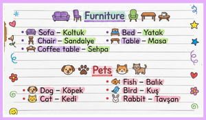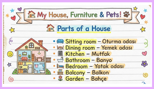 Evimizin bölümleri, eşyalar ve sevimli dostlarımız! Öğrencilerin görsel hafızasına hitap eden, rengarenk ve eğlenceli İngilizce kelime notumuzu hemen indirip derslerinizde kullanabilirsiniz.