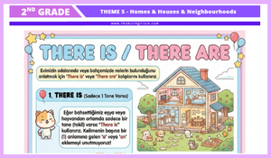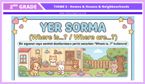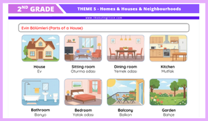 2. sınıf 5. tema “Homes, Houses & Neighbourhoods” konusuna yönelik hazırladığımız bu görsel destekli çalışma dosyası; öğrencilerin hem kelime bilgisini geliştirmeyi hem de temel cümle kalıplarını eğlenceli ve anlaşılır bir şekilde öğrenmelerini amaçlamaktadır.