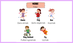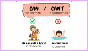 İkinci sayfada ise eylemler (verbs) ve yetenek ifade eden “can / can’t” yapıları öğretilmektedir. “Jump (zıplamak)”, “Swim (yüzmek)”, “Play football (futbol oynamak)” gibi fiiller resimlerle desteklenmiştir. Öğrenciler, “I can play football.” veya “He can’t swim.” gibi örneklerle yapabildikleri ve yapamadıkları şeyleri ifade etmeyi öğrenirler.