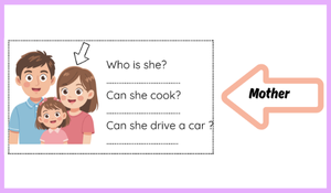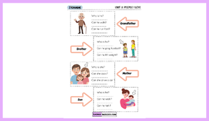Bu çalışma, 3. sınıf People I Love ünitesi kapsamında öğrencilerin aile bireylerini tanımlama ve “Can / Can’t” yapısını doğru şekilde kullanma becerilerini geliştirmek için hazırlanmış etkili bir etkinliktir. Öğrenciler, görsellerdeki aile üyelerini tanıyarak “Who is he/she?” sorusuna yanıt verir ve ardından verilen eylemler üzerinden “Can he walk?”, “Can she cook?” gibi sorulara uygun cevaplar yazarak temel iletişim becerilerini pekiştirir.