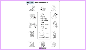3. sınıf İngilizce Feelings ünitesi için hazırladığımız öğrencilerin duygu ifadelerini günlük eylemlerle ilişkilendirmesini hedefleyen kapsamlı bir worksheet sizlerle. Öğrencilerin fiilleri doğru görsellerle eşleştirmeleri ve “Let’s …” kalıbını cümle tamamlama etkinlikleri sayesinde happy, angry, tired, hungry, thirsty gibi temel duygu ifadeleri ile birlikte kullanmaları hedeflenmiştir.