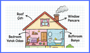 Resimli Sözlük: Evin bölümleri (Roof, Kitchen, Bedroom, Garden vb.) akılda kalıcı ve renkli görsellerle tanıtılıyor.