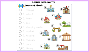 3. sınıf İngilizce dersi 7. Ünite: “In My City” konusunda geçen kelimeleri pekiştirmek amacıyla hazırladığımız, öğrencilerin şehirde bulunan yerleri tanımaları ve bu kelimeleri doğru şekilde kullanmalarını hedefleyen çalışma kağıdımız sizlerle.