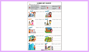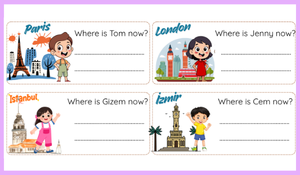 3. sınıf 7. ünite “In My City” konusuna yönelik hazırladığımız bu çalışma, öğrencilerin “Where is…?” soru kalıbını öğrenmelerini, bulundukları şehir ile ilgili cevap vermelerini ve pekiştirmelerini amaçlayan bir etkinliktir. Çalışmada öğrenciler, farklı kişilerin hangi şehirde olduklarını sorup cevaplayarak hem soru sorma hem de cevap verme becerilerini geliştirirler.
