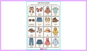 4. SINIF 8. ÜNİTE MY CLOTHES için hazırladığımız, öğrencilerin kıyafetler, aksesuarlar ve hava durumu ile ilgili temel İngilizce kelimeleri öğrenmelerini ve pekiştirmelerini amaçlayan resimli kelime listesi ve konu özetinden oluşan çalışma sizlerle.