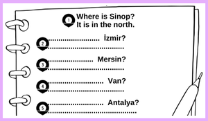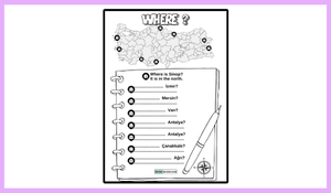 Bu eğlenceli ve interaktif İngilizce çalışma kağıdı ile öğrenciler, Türkiye'nin illerinin coğrafi konumlarını öğrenirken aynı zamanda İngilizce "Nerede?" (Where?) sorularına cevap vermeyi pratik edecekler.