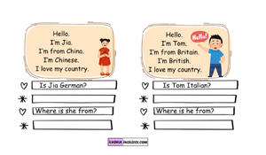 4. Sınıf İngilizce Dersi 2. Tema (Theme 2) olan Countries & Nationalities (Ülkeler ve Milliyetler) konusunu pekiştirmek için harika bir diyalog tamamlama materyali!