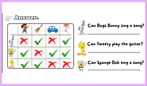 Sayfanın ilk bölümünde öğrenciler, tabloya bakarak karakterlerin neleri yapıp yapamayacağını belirler ve “Can Bugs Bunny sing a song?” gibi sorulara doğru cevapları yazarak can–can’t yapısını uygulamalı şekilde öğrenirler.