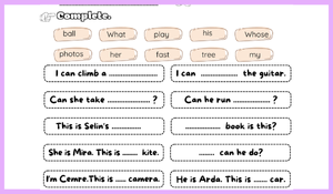 Bu çalışma sayfası, 4. sınıf İngilizce dersinde Can / Can’t yapısını ve sahiplik belirten ifadeleri (my, his, her, whose) pekiştirmek için hazırlanmıştır. Renkli ve eğlenceli çizgi film karakterleri sayesinde öğrenciler, hem okuduğunu anlama hem de doğru cümle kurma becerilerini geliştirir.