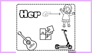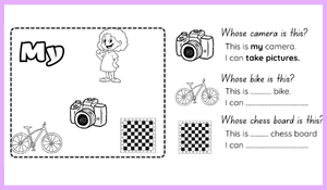 Etkinlikte öğrenciler, sahiplik bildiren zamirleri (my, his, her) doğru şekilde kullanarak boşlukları doldururlar. Her karakterin kendine ait eşyaları (kamera, bisiklet, satranç tahtası, araba, kitap, top, gitar, puzzle, scooter) görsellerle verilmiştir. Öğrenciler “Whose... is this?” sorularını okuyarak, eşyaların kime ait olduğunu belirler ve “I can / He can / She can” yapılarıyla kısa cümleler oluştururlar.