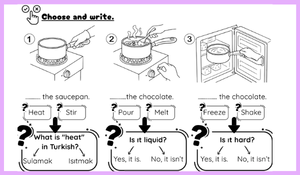 4. sınıf İngilizce dersi 6. Ünite “Fun with Science” kazanımlarını desteklemek amacıyla hazırladığımız, öğrencilerin bilimsel kavramları eğlenerek öğrenmelerini hedefleyen çalışma kağıdı sizlerle.. Çalışmada heat, melt, freeze, stir, pour, shake gibi temel bilim ve deney temalı kelimeler günlük yaşamdan örneklerle ele alınmış; öğrencilerin kelime bilgisi, okuma-anlama ve yazma becerileri bütüncül bir şekilde desteklenmiştir.