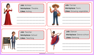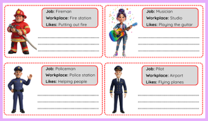 Öğrenciler, farklı meslekleri, bu mesleklerin çalışma alanlarını ve sevdikleri faaliyetleri öğrenerek kelime bilgilerini geliştirirler. Verilen örneğe bakarak “He/She is…”, “He/She works at…”, “He/She likes…” kalıplarını kullanarak cümle yazma becerilerini geliştirirler.