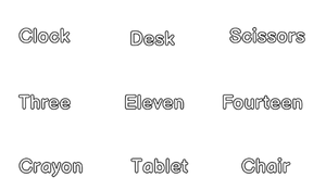 Sınıf Nesneleri: Pencil, sharpener, rubber, clock, desk, scissors, crayon, tablet, chair, whiteboard, chalk, glue gibi temel sınıf eşyaları kelimelerini içeren resimler ve yazılı halleri.