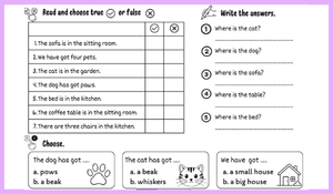 Doğru/Yanlış Değerlendirmesi: Çalışmada "Read and choose true or false" bölümü yer almaktadır. Öğrenciler okuduklarını pekiştirmek için "The sofa is in the sitting room." veya "We have got four pets." gibi cümlelerin metne göre doğruluğunu analiz ederler.