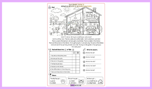 Okuma Anlama Pratiği: Öğrenciler öncelikle "Read." yönergesini takip ederler. Oturma odası, yatak odası ve mutfak gibi evin bölümlerini anlatan kısa ve anlaşılır bir İngilizce metni okurlar.
