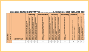 2. Sınıf İngilizce derslerinde minik öğrencilerimizin gelişimini takip etmek artık çok daha kolay ve sistemli! ilkokulingilizce.com olarak, yeni müfredat kazanımlarıyla birebir uyumlu, iş yükünüzü hafifletecek harika bir değerlendirme çizelgesi hazırladık.