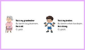 Birinci sayfada, İngilizce’de sıkça kullanılan zıt anlamlı kelimeler (opposites) tanıtılmaktadır. “Short x Tall (Kısa x Uzun)”, “Fat x Slim (Şişman x Zayıf)”, “Fast x Slow (Hızlı x Yavaş)” gibi örneklerle öğrencilerin kelime dağarcıkları zenginleştirilmektedir. Ayrıca, “This is my grandmother. She is old.” gibi kısa tanıtıcı cümlelerle öğrenciler aile bireylerini tanıtmayı öğrenirler. Görselde yer alan sorular (“Is she young?”, “Is he tall?”) ile evet/hayır cevapları (Yes, he is. / No, he isn’t.) pekiştirilir.