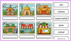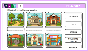 Öğrencilerden şehirde bulunan çeşitli yerlerin isimlerini doğru görsellerle eşleştirmeleri ve altlarına yazmaları istenmektedir.