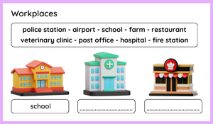 Öğrenciler, çeşitli meslekleri tanıyarak bu kişilerin nerede çalıştıklarını eşleştirme etkinlikleri yapar.