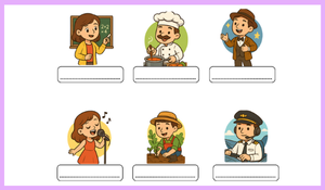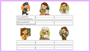 Meslekler ve bu mesleklerin yaptığı işler üzerinden cümle kurma alıştırmaları içerir.