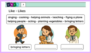 "Unit 7: Jobs" başlığını taşır ve "like - likes" yapısının kullanımını öğretmeyi amaçlar.