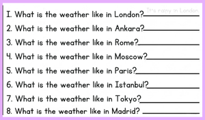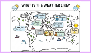 Öğrencilerinizin İngilizce "Hava Durumu" (Weather) konusunu hem görsel hafızalarını kullanarak hem de eğlenerek öğrenmesi için harika bir materyal! 4. sınıf müfredatına (8. Ünite) uygun olarak hazırlanan bu çalışma kağıdı, öğrencileri dünya çapında mini bir coğrafya turuna çıkarırken, aynı zamanda temel İngilizce soru-cevap becerilerini pekiştirmeyi hedefliyor.