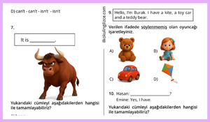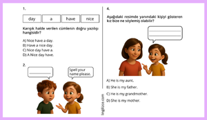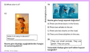 Sorular İngilizce dersi kazanımlarına yönelik çoktan seçmeli test formatında hazırlanmış.