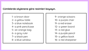 Öğrencilerden, verilen yönergelere göre sınıf eşyalarını doğru renklerle boyamaları istenmektedir.