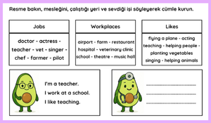 Öğrencilerden verilen görselleri inceleyip "I’m a ..., I work at ..., I like ..." kalıplarıyla kendi cümlelerini kurmaları beklenir.