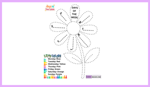 1. Günleri Tamamlama: Çiçeğin her yaprağında bir günün baş harfi (M, T, W, T, F, S, S) verilmiştir. Çocuklar, kesik çizgilerin üzerine doğru günün İngilizce ismini tamamlayarak yazarlar. (Örn: M_ _ _ _ _ Monday)