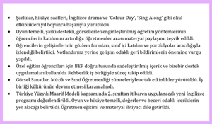 İlçedeki ilkokul İngilizce öğretmenlerinin yıl boyunca gerçekleştirdiği etkinliklerin, öğretim yöntemlerinin, başarı durumlarının ve özel eğitim uygulamalarının değerlendirilmesini içermektedir.