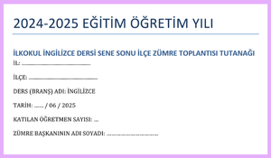 Bu dosya, 2024-2025 eğitim-öğretim yılı için ilkokul düzeyinde hazırlanmış İngilizce dersi sene sonu ilçe zümre toplantı tutanağıdır.