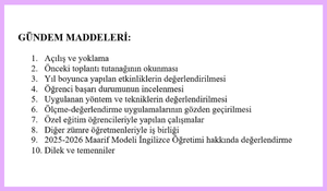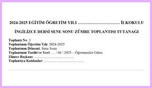 Bu dosya, 2024-2025 Eğitim Öğretim Yılı ilkokul düzeyinde İngilizce dersi için hazırlanmış sene sonu zümre toplantı tutanağıdır.