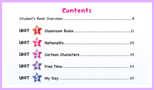 Kitapta görsellerle desteklenmiş etkinlikler, kelime listeleri ve günlük konuşmalar yer almaktadır.