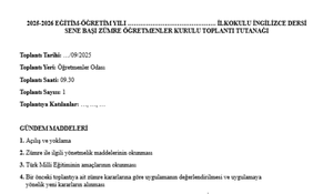 Bu dosya, 2025-2026 Eğitim Öğretim Yılı ilkokul düzeyinde İngilizce dersi için hazırlanmış sene başı zümre toplantı tutanağıdır.