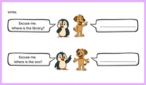 Öğrencilerden çeşitli yerlerin (kütüphane, hayvanat bahçesi, hastane gibi) konumunu soran diyalogları tamamlamaları beklenir 🏥📖🦁.