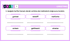 "Greetings" teması etrafında şekillenen etkinliklerde sayılar, kelime sıralamaları ve doğru-yanlış alıştırmaları yer almaktadır.