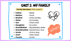 3. sınıf 2. ünite "My Family" ünitesi içinde geçen kelimeler ve ifadeleri bir arada bulabileceğiniz bir kelime listesidir.